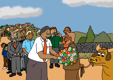 aan. Hij had een jonge koe aan een touw. Wat moest dat te