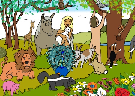 Het was af. God vond dat het HEEL erg mooi was nu. Daarom rustte God op de zevende dag. Nee, God was niet moe, zoals wij dat soms zijn. God stond stil samen met Adam en Eva en zij bewonderden al het moois dat God gemaakt had voor de mensen.