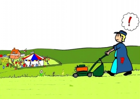 Toen zijn broer, die bezig was met het maaien van het gras, zag dat er gefeest werd, keek hij even verbaasd. "Wat moet dat nu voorstellen?"