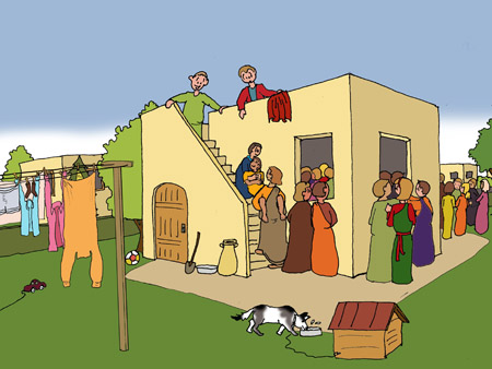 'Laten we achterom gaan en de trap naar boven nemen' stelde een van de vier vrienden voor. Onmiddellijk pakten ze hun vriend weer op, droegen hem om het huis heen en gingen de trap op naar het dak van de woning.