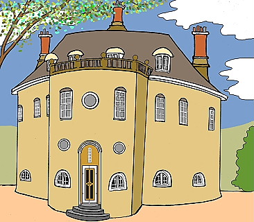 Eenmaal in de tuin, zagen ze een eindje verderop een heel vreemd rond gebouw. 'Dat is nu het kasteel van professor Openbaring' zei Opa. Opa parkeerde de auto onder de bomen en met z'n allen liepen ze naar de deur van het kasteel.