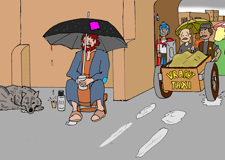 wanneer het regent en niemand iets in zijn bedelbakje gooide.