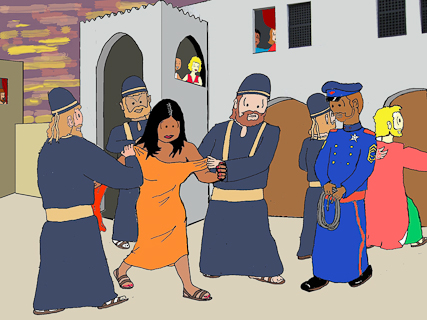 zien wat die Jezus hier over te zeggen heeft!" En dan slepen ze haar