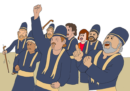 Jezus bukt voorover en heel rustig schrijft Hij iets op de grond in het zand. De Bijbelgeleerden blijven door elkaar schreeuwen want ze willen allemaal dat Jezus iets hierover gaat zeggen.