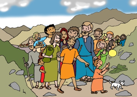 Over de heuvels van Galilea komt er een hele groep mensen aanlopen.