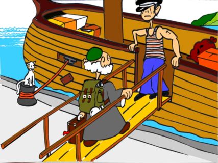 Jona zou met de boot naar Tarsis varen. Hij betaalde de kapitein van de boot en hij verstopte zich daarna in een kamertje onderin het schip.