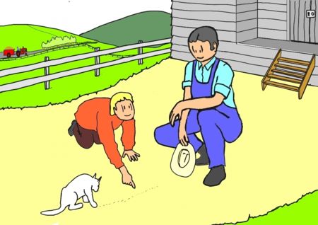 zien. "Moet je kijken Pa, hier lopen mieren!" De boer ging op