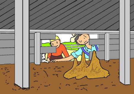 situatie is. Onder de vloer ziet hij een grote mierenhoop. Een stad