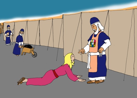 De oude priester kijkt haar streng aan. Hij denkt dat zij teveel