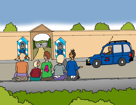 Daar zitten ze nu, met z'n vijven op de stoeprand tegenover de ingang