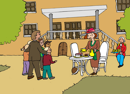 Als ze uit de auto stappen zien ze de koningin, die net thee gaat